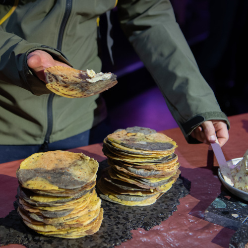 Atelier de cuisine composite  Parce qu’il faut parfois couper son pain avec ce que l’on trouve. Ainsi pourrait-on dire à Gaza, où depuis plusieurs mois, la nourriture animale supplée le manque de farine de blé. Des premières galettes de céréales sauvages de l’âge de pierre à la culture cosmopolite du wrap, le pain plat accompagne l’humanité depuis toujours. Une série de gestes simples, peut-être ancrée dans une mémoire gestuelle collective ancestrale : broyer, pétrir, façonner. Nous proposons aux participants (et aux autres) de faire les fonds de placards, les fonds de paquets, “les presque rien”, les quantités négligeables, et de collecter tous restes de farine, de légumes secs, d’herbes, de plantes comestibles (sapins, pétales etc.) d’épices etc.. afin de participer à un atelier de fabrication de pitas composites. Des pains plats à plusieurs zones, plusieurs, couleurs et saveurs que l’on explore de manière presque géographique.